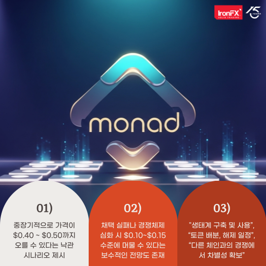 모나드는 EVM(이더리움 가상머신) 호환성과 고속 처리(TPS) 등을 지향하는 Layer-1 블록체인 프로젝트로, 기술적 잠재력이 높게 평가되고 있는데요, 다양한 분석에서 중장기적으로 MON 토큰의 가격이 $0.40 ~ $0.50까지 오를 수 있다는 낙관 시나리오도 시장 투자자들 사이에서 전망되고 있습니다.