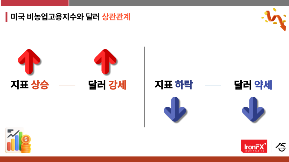 만약 비농업 지표가 예상보다 낮게 나온다면 어떻게 될까요? 실제 수치가 예상치를 밑돌 경우에는 경기 둔화 신호로 인식되어 달러 약세가 나타납니다. 경기 둔화 신호로 해석하여 금리 인하 가능성이 높아지고, 달러의 약세까지 연결되기 때문이죠.