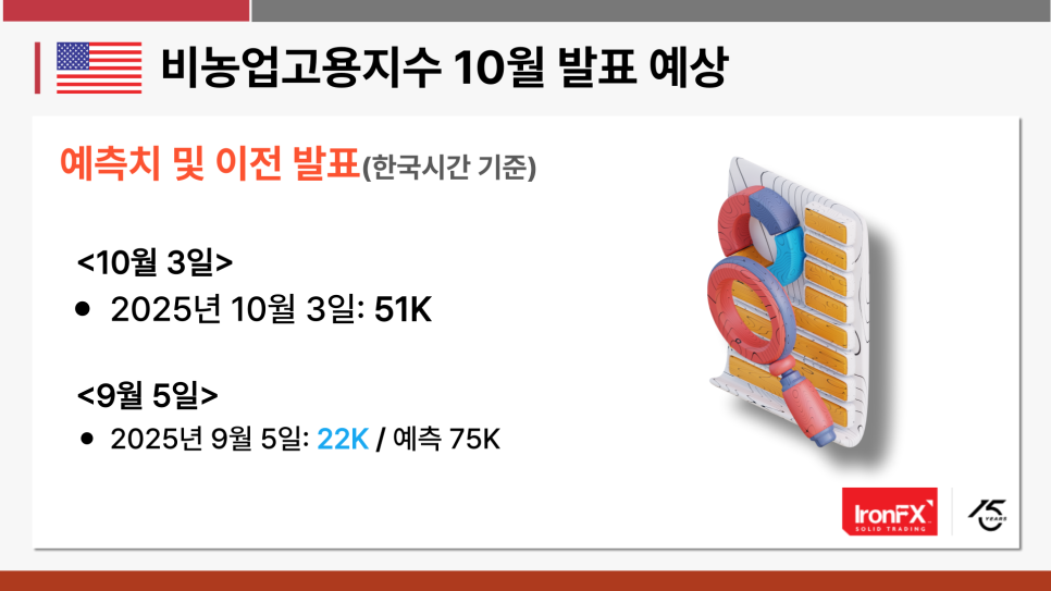 현재 시장에서는 이번 10월 발표에서 비농업고용지수가 51K 수준에서 발표될 것으로 전망되고 있습니다. 최근 고용 둔화 흐름이 일부 나타나는 가운데 어느 정도 반등 기대감이 반영된 수치입니다.