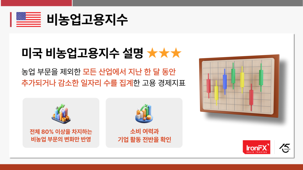 미국 비농업고용지수(NFP)는 농업 부문을 제외한 모든 산업에서 지난 한 달 동안 추가되거나 감소한 일자리 수를 집계한 대표적인 고용지표입니다. 서비스업부터 제조업, 건설업, 기타 부문을 포함하며 전체 경제활동의 약 80% 이상을 차지하는 비농업 부문의 변화만을 반영합니다.