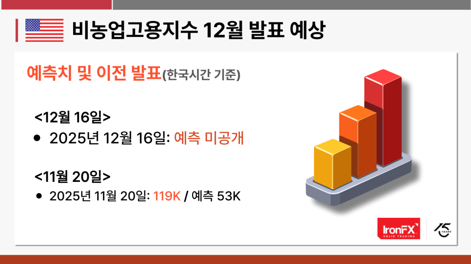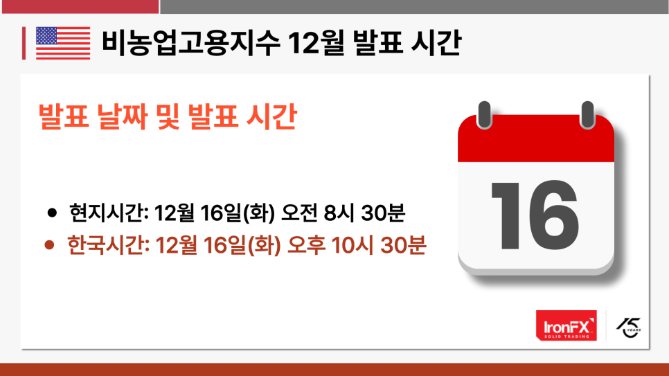 최근까지 지속됐던 미국 정부의 셧다운으로 인해 고용 데이터의 발표 일정이 지연되면서 2025년 12월 16일 화요일에 공개될 예정입니다. 한국 시간 비농업고용지수 발표 시간은 12월 16일 화요일 오후 10시 30분에 공개될 예정입니다.