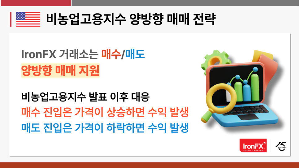 비농업고용지수 발표 시간엔 시장이 어느 방향으로 튈지 100% 확신할 수 없기 때문에 양방향 매매 전략이 유효할 수 있는데요.