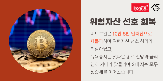비트코인은 10만 6천 달러선으로 재돌파하며 위험자산 선호 심리가 되살아났고, 뉴욕증시는 셧다운 종료 전망과 금리 인하 기대가 맞물리며 3대 지수 모두 상승세를 이어갔습니다.