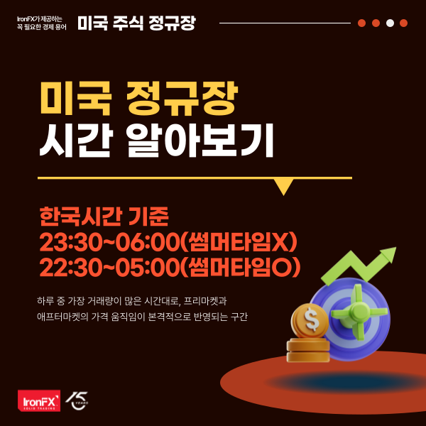 미국 주식 정규장은 한국시간 22:30~05:00(썸머타임 시), 23:30~06:00(썸머타임 해제시)에 운영됩니다.