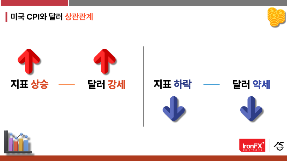 반대로 CPI가 예상보다 낮게 나와 물가가 안정되고 있다는 신호가 포착된다면, 연준은 경기 부양을 위해 금리 인하를 고려하게 되고 이땐 달러화의 약세 요인으로 작용하는 것이죠.