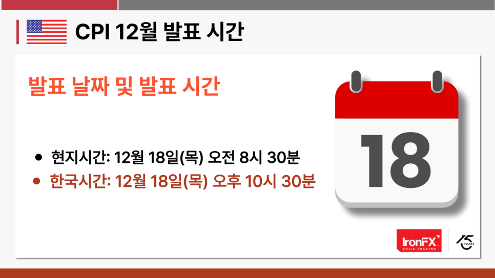 이번 미국 CPI 발표 시간은 한국 시간 기준으로 12월 18일(목) 오후 10시 30분입니다.