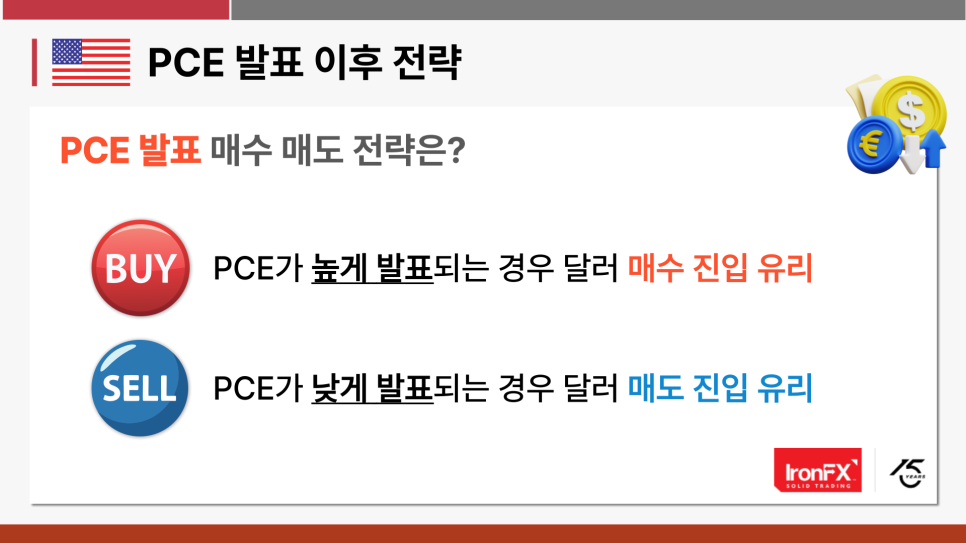 발표 결과가 달러 강세 요인(PCE 상회)이라면, 주요 저항선을 돌파하는 눌림목에서 달러 매수 포지션을 구축하는 것이 유리합니다. 반대로 달러 약세 요인(PCE 하회)이라면 지지선 이탈을 확인하고 매도 포지션을 잡는 것이 많이 쓰이는 매매 전략이기도 하죠.
