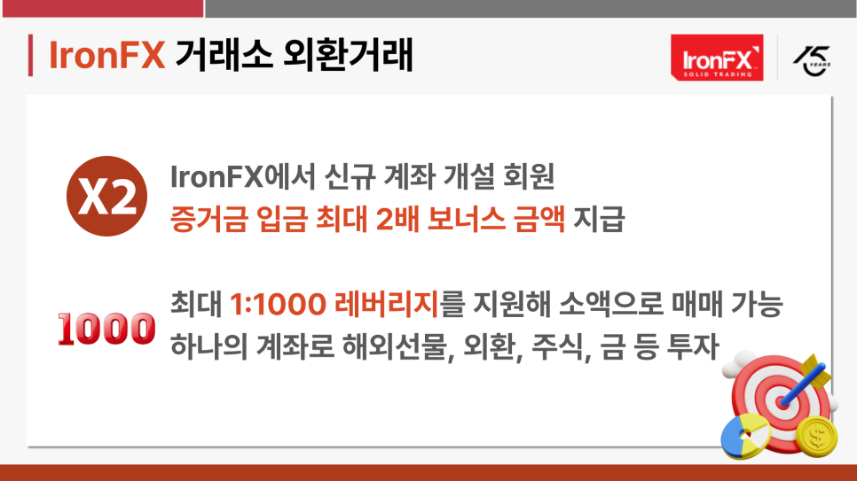 IronFX는 양방향 매매는 물론 투자자의 성향에 맞는 유연한 레버리지를 제공하여 적은 자본으로도 효율적인 거래가 가능하게 합니다. 또한, 전 세계적으로 서비스하고 있으며, 1700만 이상의 고객 및 금융 감독 규제 라이센스를 보유하고 있습니다.