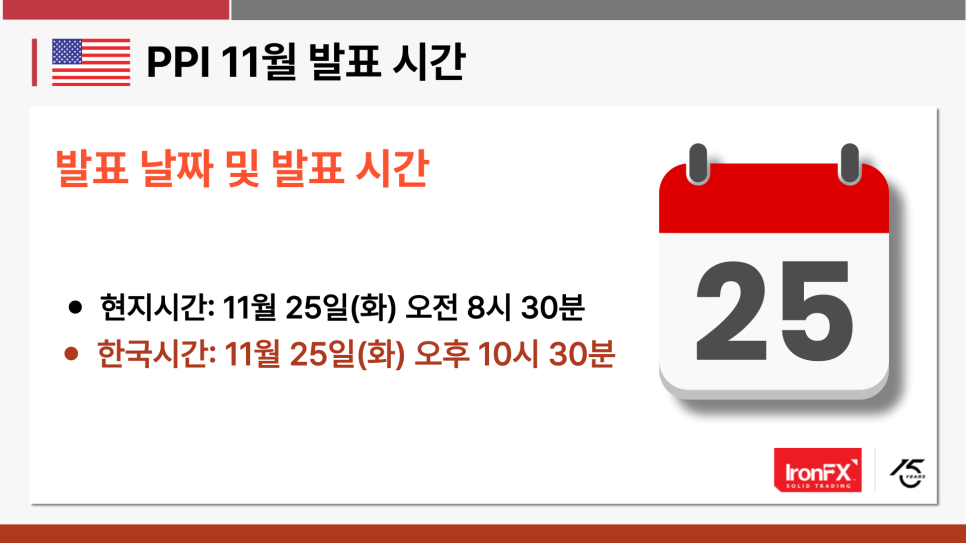 한국시간으로 환산하면 썸머타임이 끝났으므로 보통 밤 10시 30분이며, 이번 PPI 발표 시간은 한국 시간 11월 25일 화요일 오후 10시 30분입니다.