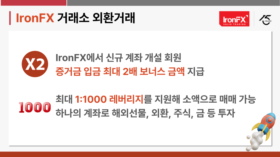 IronFX는 글로벌 외환 및 해외선물 시장에서 다년간 경험과 신뢰를 갖춘 플랫폼입니다. 다양한 통화쌍과 레버리지 옵션을 제공하며 발표 이벤트와 같이 변동성이 확대되는 시기에도 유연하고 신속한 대응이 가능합니다.