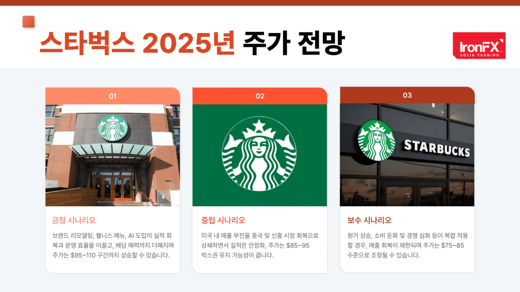 스타벅스 주식의 기업 정보, 배당 현황, 실적 및 재무제표, 최근 이슈 3가지, 기술적 차트 분석, 2025년 주가 전망 3가지 시나리오, 그리고 IronFX 메타트레이더4 플랫폼을 활용한 거래 방법까지 체계적으로 다뤄보겠습니다.
