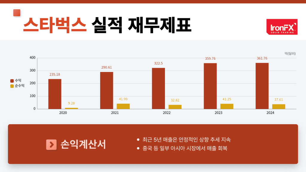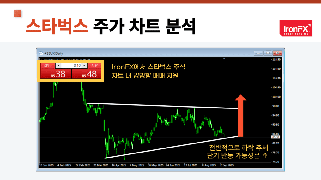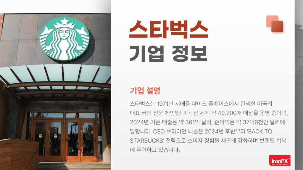 스타벅스 주식의 기업 정보, 배당 현황, 실적 및 재무제표, 최근 이슈 3가지, 기술적 차트 분석, 2025년 주가 전망 3가지 시나리오, 그리고 IronFX 메타트레이더4 플랫폼을 활용한 거래 방법까지 체계적으로 다뤄보겠습니다.