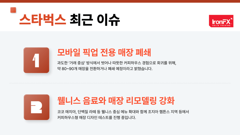 1. 모바일 픽업 전용 매장 폐쇄: 과도한 ‘거래 중심’ 방식에서 벗어나 따뜻한 커피하우스 경험으로 회귀를 위해, 약 80~90개 매장을 전환하거나 폐쇄 예정입니다.