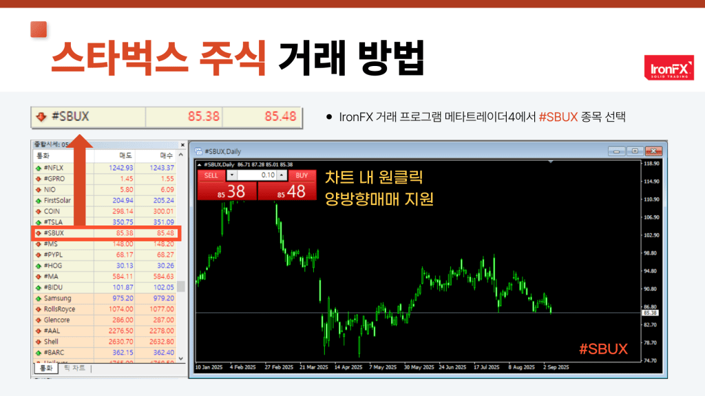 IronFX의 메타트레이더4 거래 플랫폼을 실행 후, 좌측 종합시세 창에서 ‘SBUX’ 종목을 선택하면 즉시 스타벅스 주식 차트를 확인할 수 있습니다. 차트 내 원클릭 양방향 매매 기능을 통해 매수와 매도를 매우 간편하게 주문할 수 있으며, IronFX MT4는 초보자와 전문가 모두에게 최적화된 거래 환경을 제공합니다.