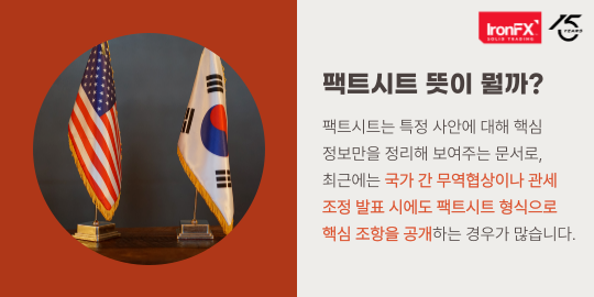 안녕하세요. IronFX입니다. 오늘은 정책 자료의 핵심 문서 중 하나인 팩트시트 뜻과 최근 발표된 관세 협상 발표 내용을 함께 살펴보겠습니다. 정책 및 무역 흐름이 투자 및 경제 환경에 미치는 영향도 분석해보도록 하겠습니다.