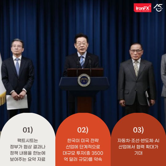 팩트시트는 정부가 협상 결과나 정책 내용을 한눈에 보여주는 공식 요약 자료로, 이번 한미 발표에서는 투자·관세·산업 협력 내용을 중심으로 정리된 문서입니다.