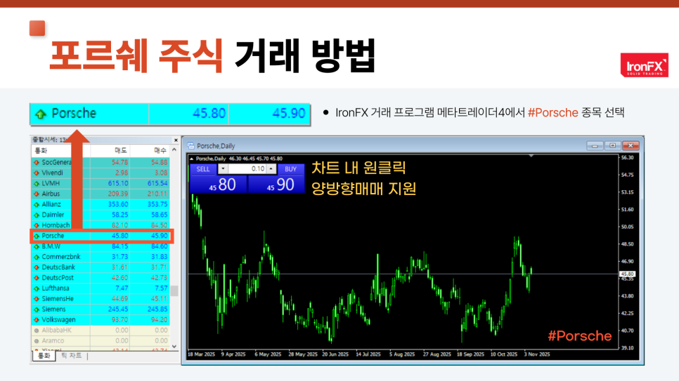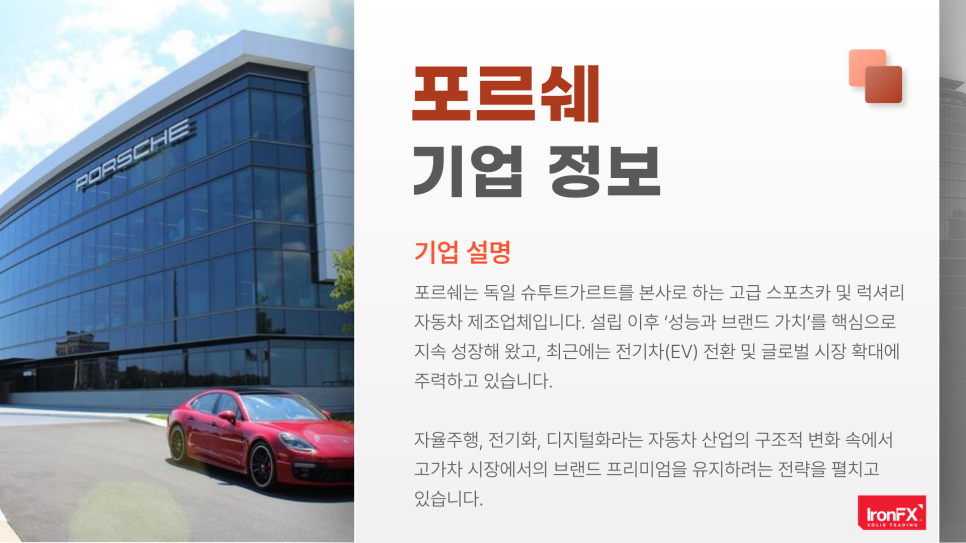 오늘은 독일의 프리미엄 자동차 기업 포르쉐 주식에 대해 기업 정보부터 배당, 재무실적, 최근 이슈, 주가 분석, 전망까지 종합적으로 살펴보겠습니다. 또한 IronFX에서 주식 매매를 고려하는 분들을 위한 실전 매매 방법도 정리해 드리겠습니다.