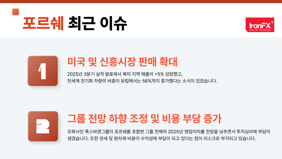 앞서 언급한 것처럼, 모회사인 폭스바겐그룹이 포르쉐를 포함한 그룹 전체의 2025년 영업이익률 전망을 낮추면서 투자심리에 부담이 생겼고, 관세 및 원자재 비용 또한 수익성에 부담이 되고 있다는 점이 리스크로 부각되고 있습니다.