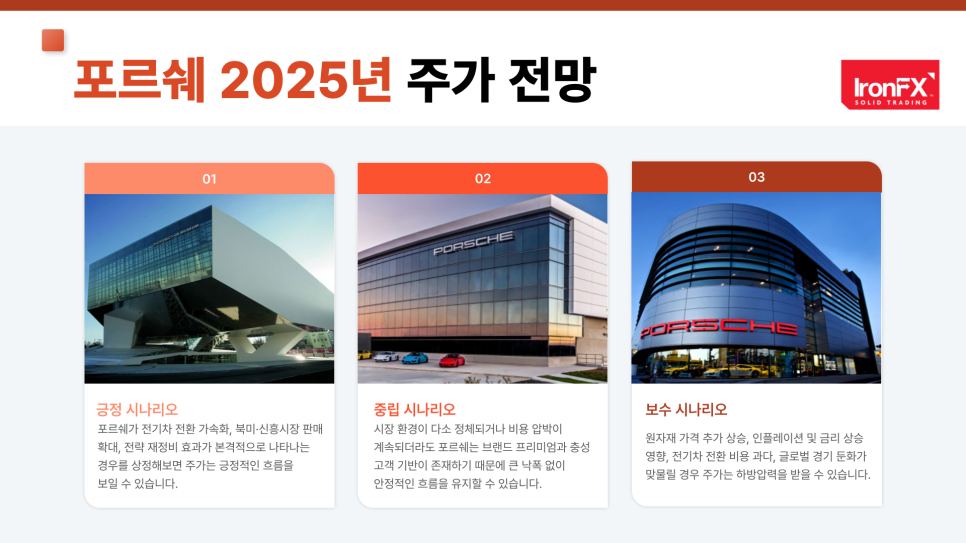 시장 환경이 다소 정체되거나 비용 압박이 계속되더라도 포르쉐는 브랜드 프리미엄과 충성고객 기반이 존재하기 때문에 큰 낙폭 없이 안정적인 흐름을 유지할 수 있습니다.