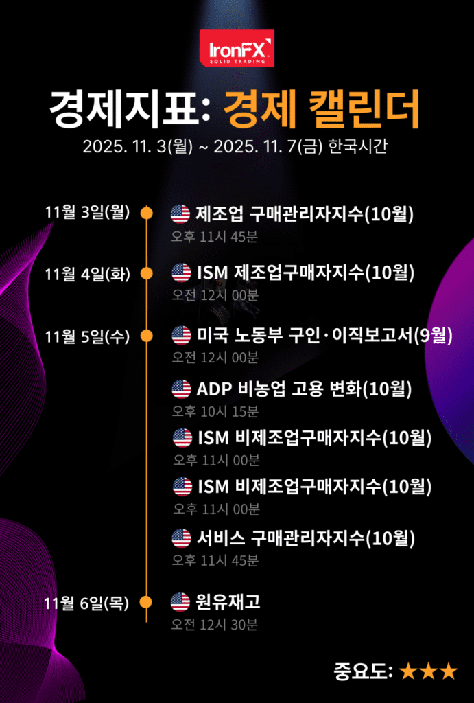 안녕하세요. IronFX입니다. 이번 11월 첫째 주 미국 경제지표 발표는 제조업, 서비스업, 고용, 원유 등 다양한 분야의 지표가 연속 발표되는 만큼 시장의 방향성이 바뀌기 쉬운 구간입니다. 특히 ADP 고용보고서와 ISM 지표 결과는 연준의 정책 기대치와 달러 흐름을 좌우할 수 있으므로 발표 일정을 잘 확인하신 후 매매하시길 바랍니다.