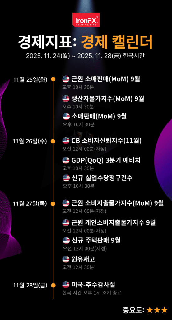 금요일은 미국의 추수감사절이 있어 시장은 조기 마감됩니다. 따라서 주간 내 발표된 지표들의 반응이 금요일까지 잔존하며 시장 정리가 이루어질 가능성이 큽니다. 발표가 끝난 이후 투자자들은 누적된 리스크를 정리하며 달러·금리·주식 시장에서 포지션 조정에 나설 수 있습니다.