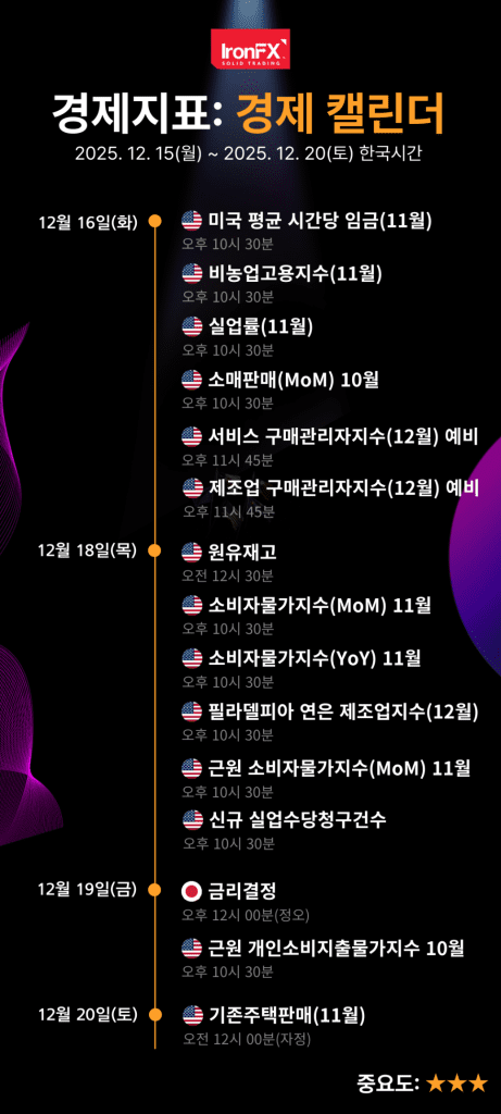 안녕하세요. IronFX입니다. 2025년 12월 셋째 주는 미국 경제 흐름을 판단할 수 있는 핵심 미국 경제지표들이 발표 일정에 몰려 있는 중요한 주간입니다.