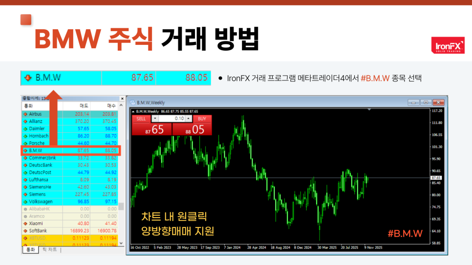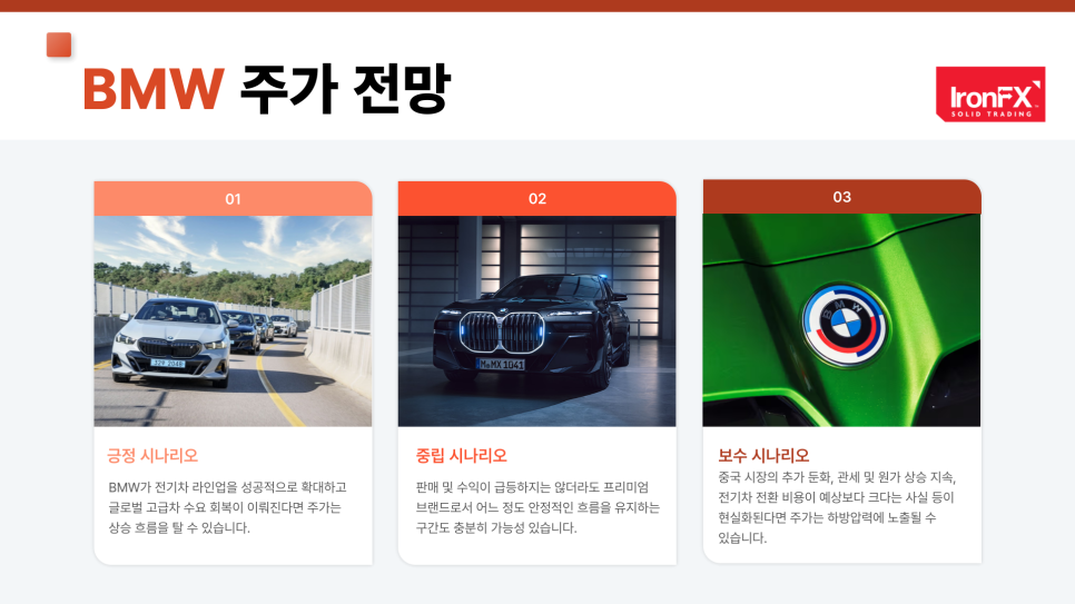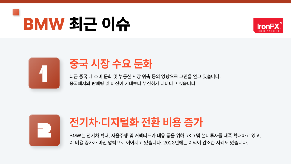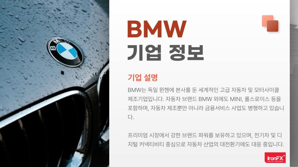 안녕하세요. IronFX입니다. 오늘은 독일을 대표하는 프리미엄 자동차 기업인 BMW 주식에 대해, 기업 정보부터 배당 현황, 실적 및 재무제표, 최근 주요 이슈, 주가 차트 분석, 2025년 주가 전망 그리고 IronFX 플랫폼을 통한 매매 방법까지 종합적으로 살펴보도록 하겠습니다.